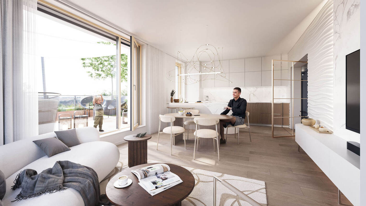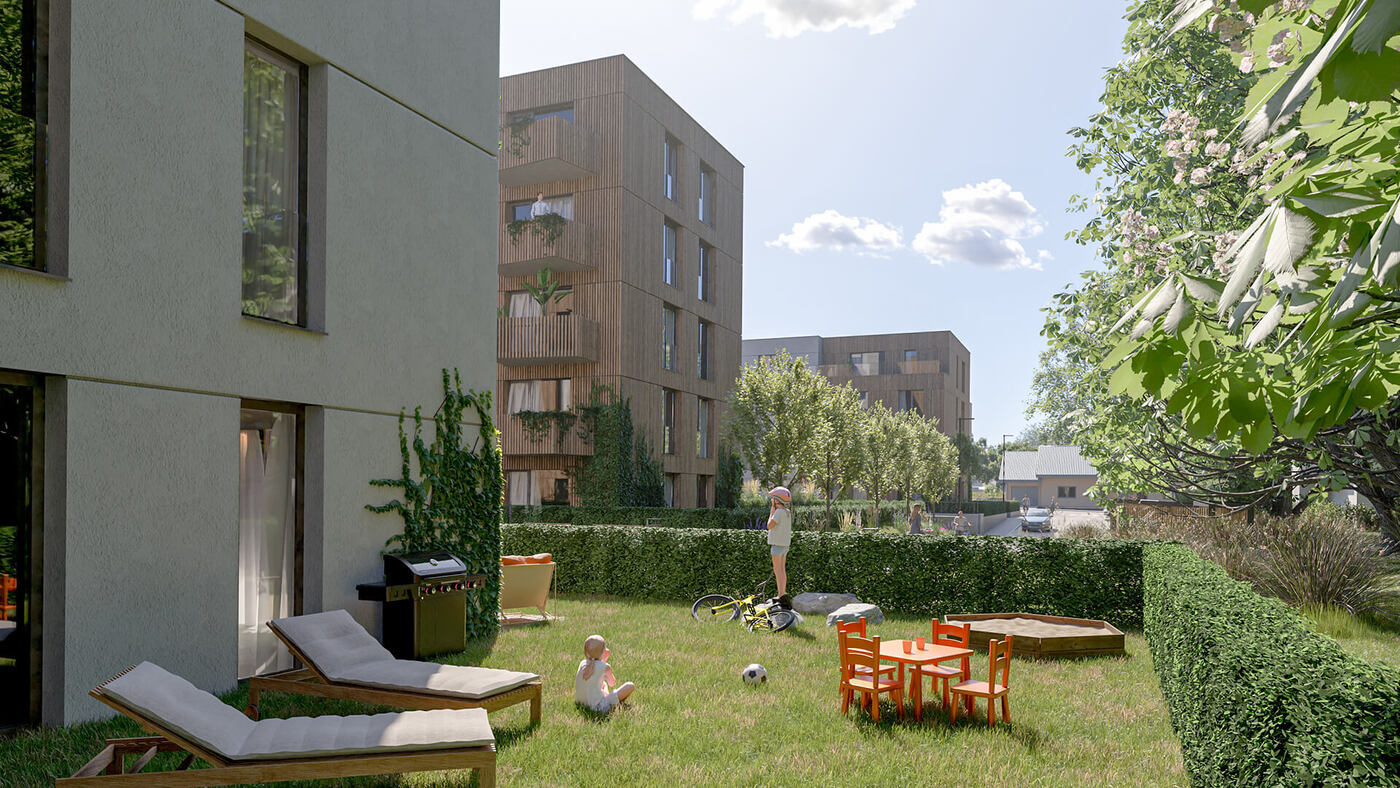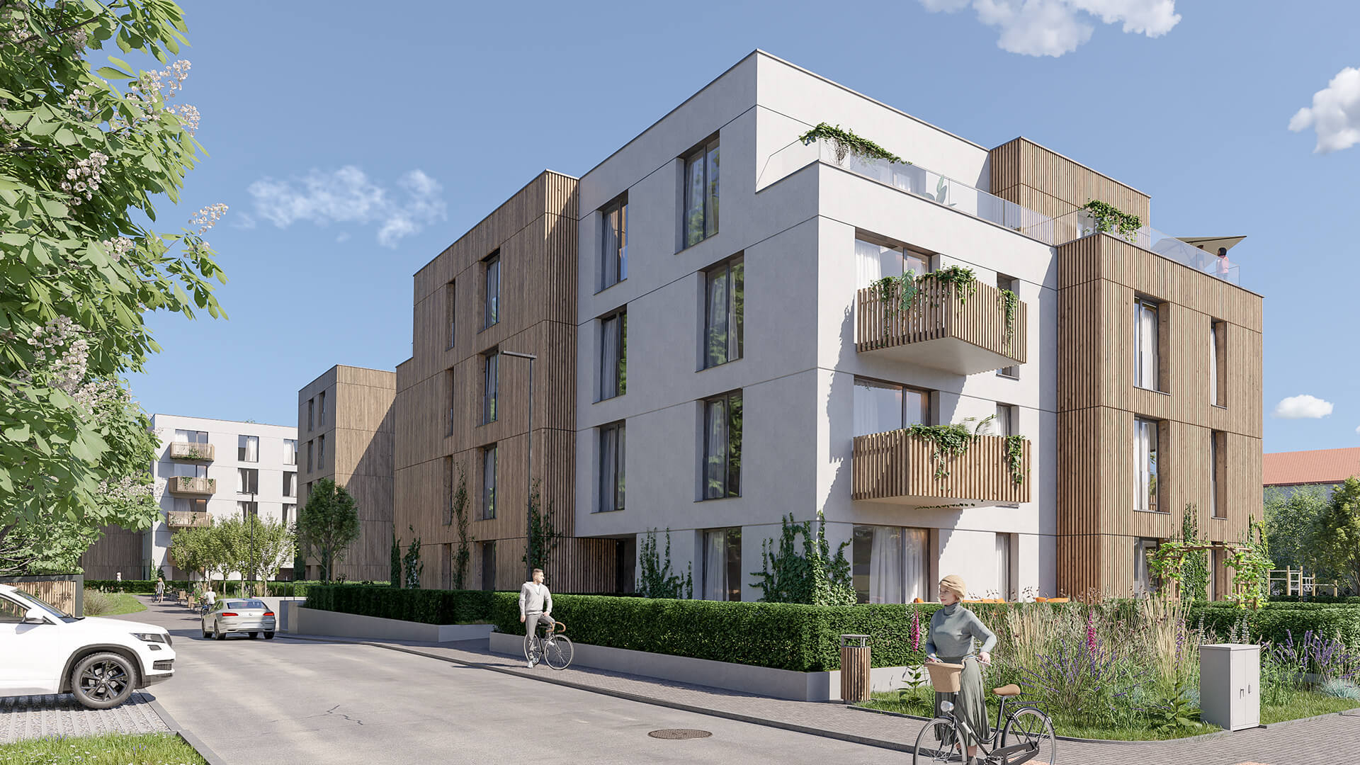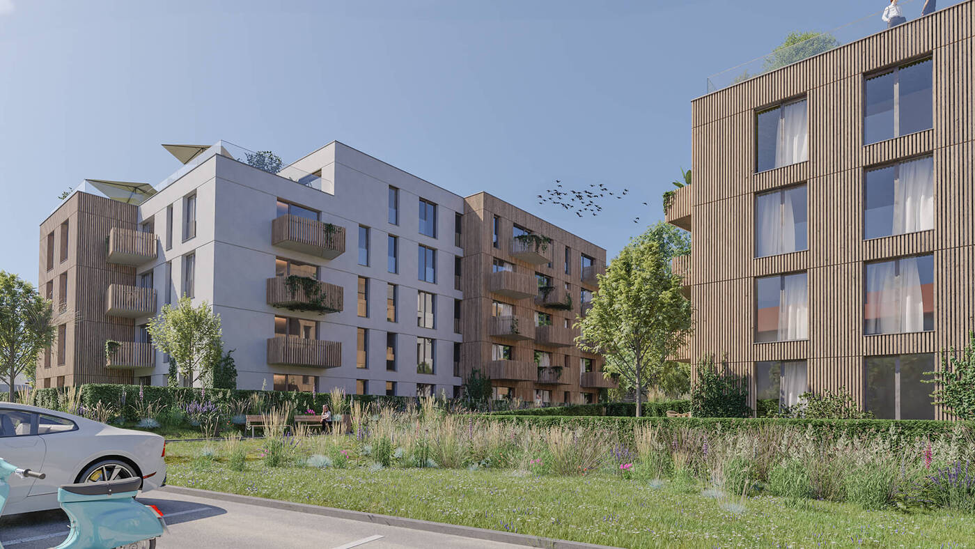Za zádveřím následuje prostorná hala odkud je umožněn přístup do dalších podlaží pomocí dvouramenného schodiště či výtahu. V nadzemních podlažích jednotlivých bytových domů jsou situovány pouze byty o velikostech od 1kk do 4kk. Byty v přízemí mají předzahrádku, každý byt v nadzemním podlaží má balkón. V ustoupeném podlaží se nacházejí byty s balkóny nebo střešními terasami s vegetační střechou.