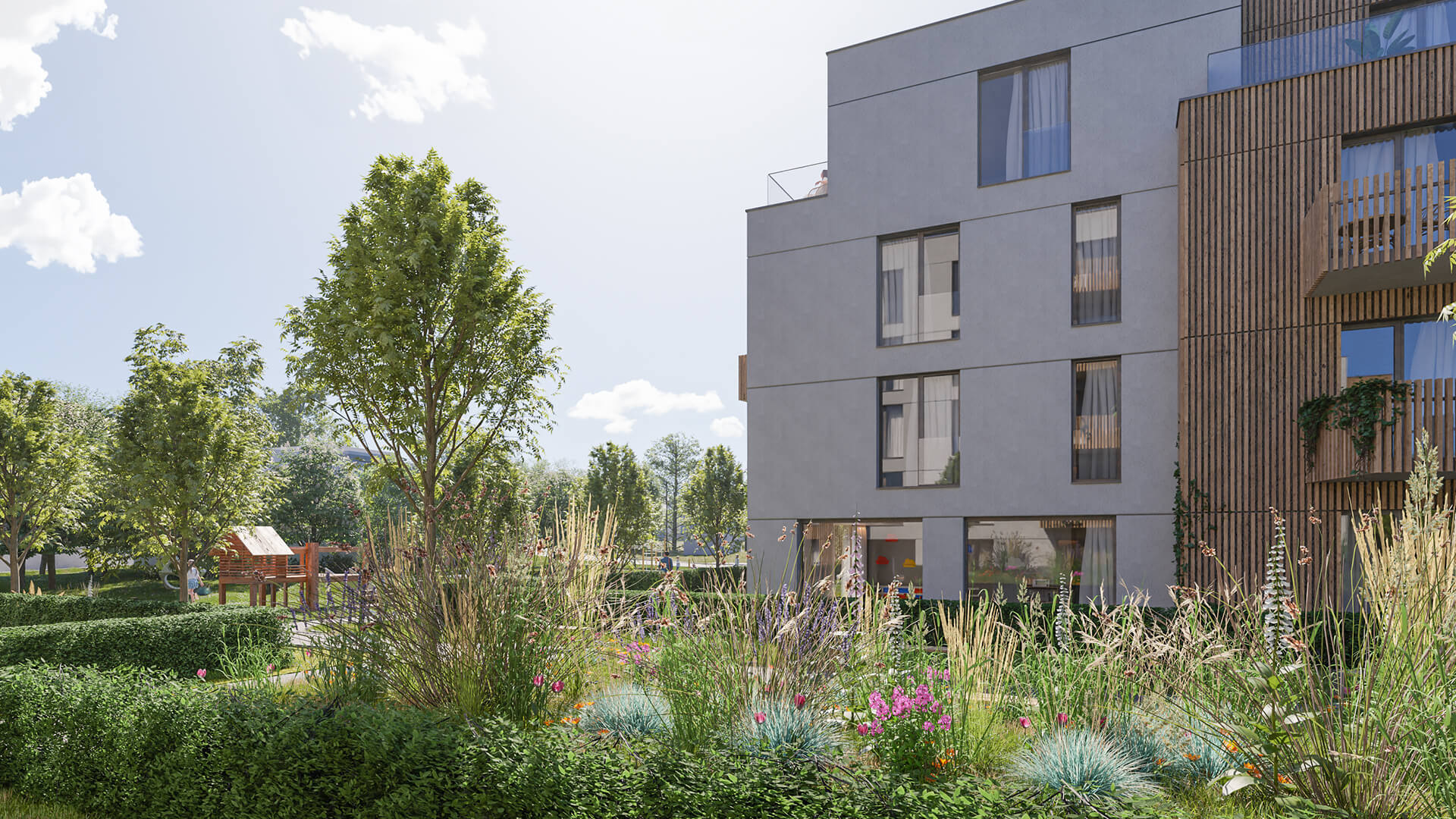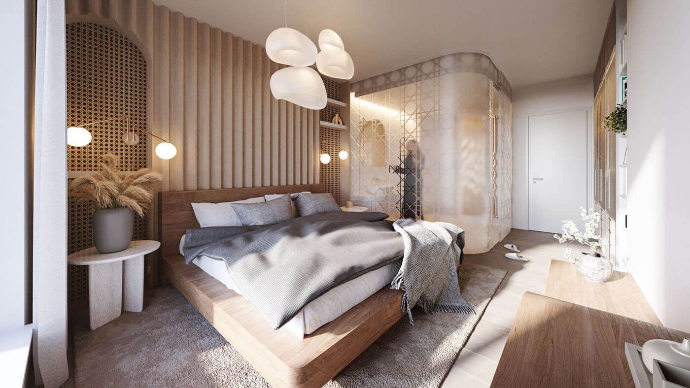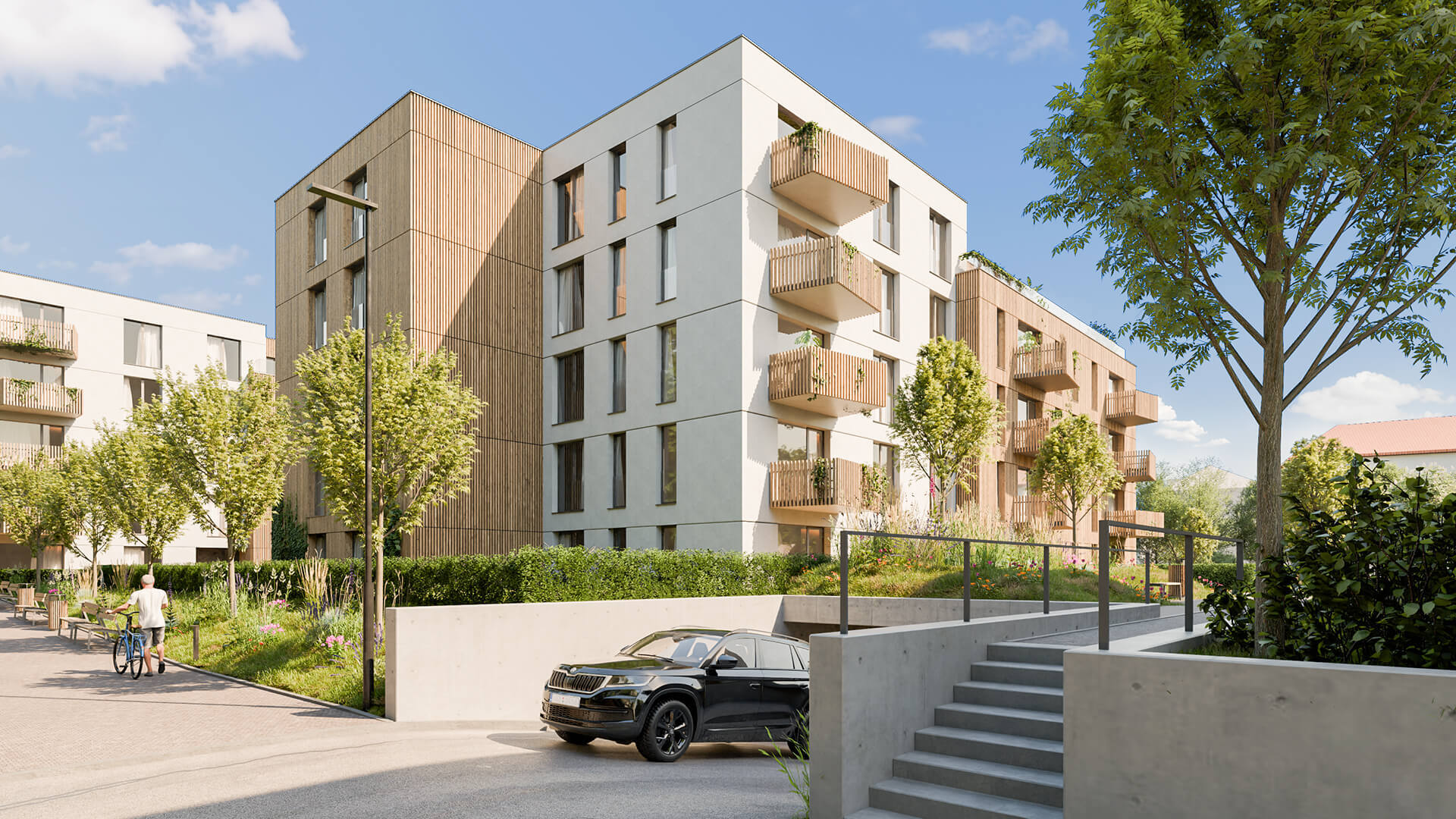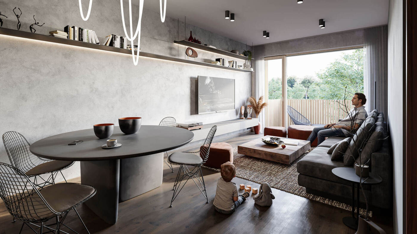 Za zádveřím následuje prostorná hala odkud je umožněn přístup do dalších podlaží pomocí dvouramenného schodiště či výtahu. V nadzemních podlažích jednotlivých bytových domů jsou situovány pouze byty o velikostech od 1kk do 4kk. Byty v přízemí mají předzahrádku, každý byt v nadzemním podlaží má balkón. V ustoupeném podlaží se nacházejí byty s balkóny nebo střešními terasami s vegetační střechou.