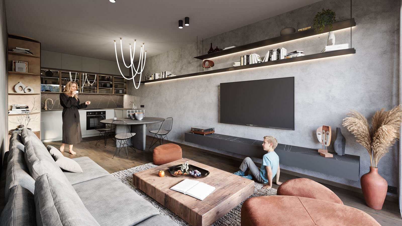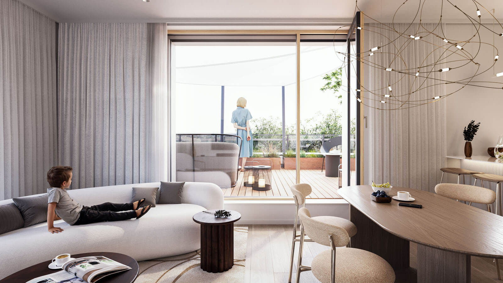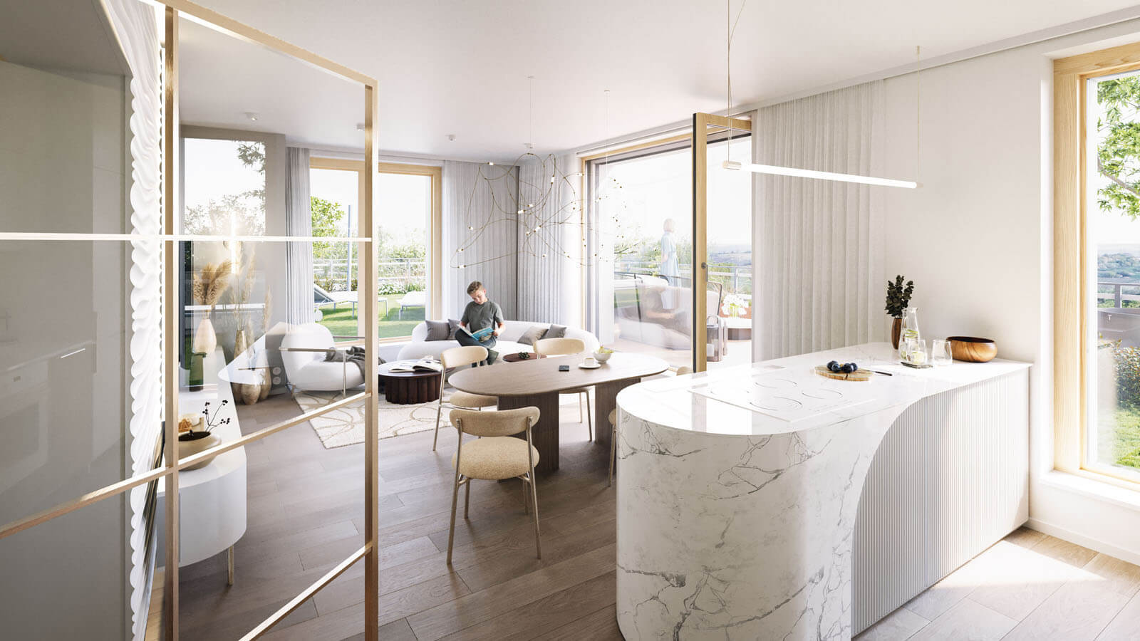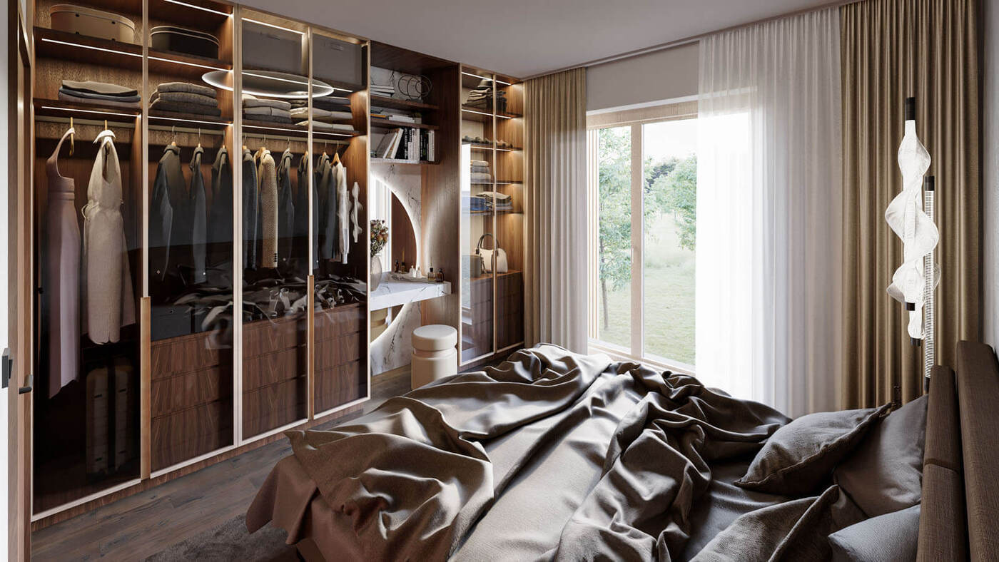 Za zádveřím následuje prostorná hala odkud je umožněn přístup do dalších podlaží pomocí dvouramenného schodiště či výtahu. V nadzemních podlažích jednotlivých bytových domů jsou situovány pouze byty o velikostech od 1kk do 4kk. Byty v přízemí mají předzahrádku, každý byt v nadzemním podlaží má balkón. V ustoupeném podlaží se nacházejí byty s balkóny nebo střešními terasami s vegetační střechou.