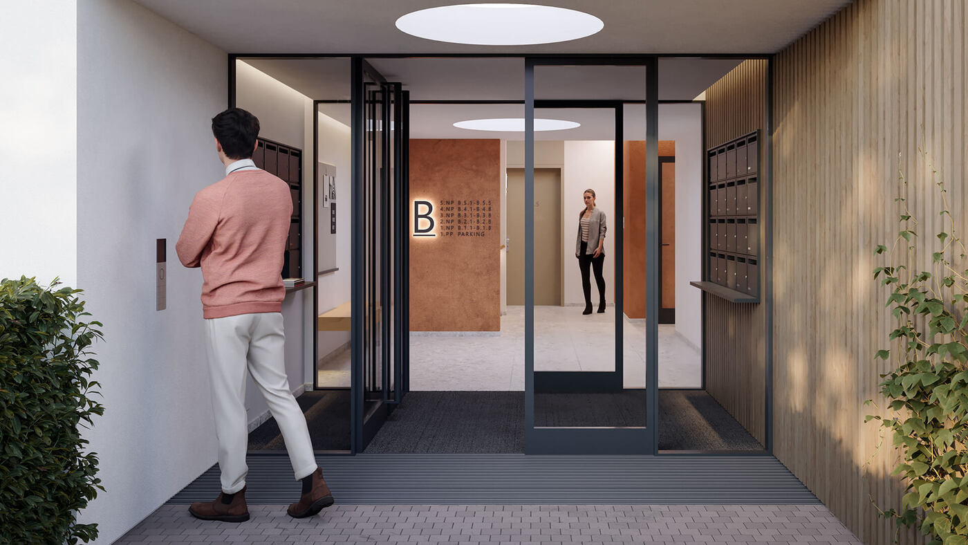 Vstupy pro residenty a návštěvníky do jednotlivých bytových domů A, B, i C je navržen v úrovni 1.NP. Z částěčně chráněného závětří se zvonkovým tablem a videovrátným se do jednotlivých objektů vstupuje skrze zádveří s poštovními schránkami. Tyto vstupy jsou bezbariérově přístupné.